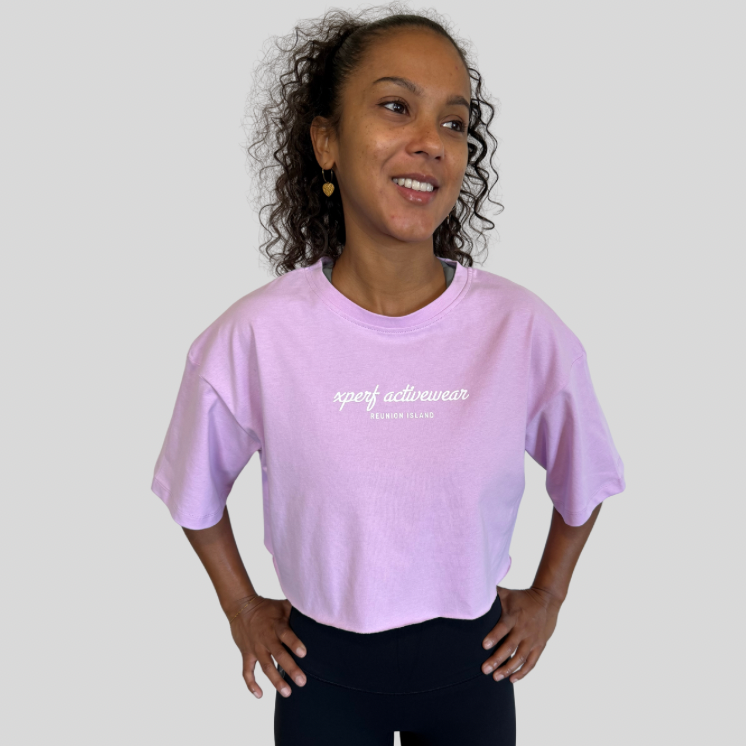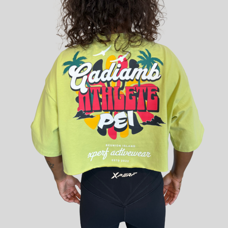 Le crop top oversize signé XPERF est un hommage coloré aux athlètes de La Réunion. Avec son design “Gadiamb Athlète Péï” au dos, il allie confort et identité forte.